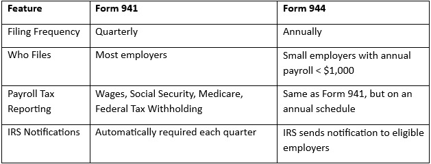 There are small businesses that might be left wondering what the difference between Form 941 and Form 944 is. Here’s a quick comparison: