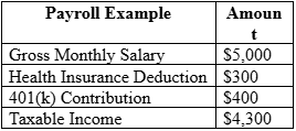 As an example, a worker with a monthly income of $5,000 can make payments to health insurance and retirement savings based on payroll deductions. Since these contributions are deducted, the taxable income of the employee is considerably reduced.